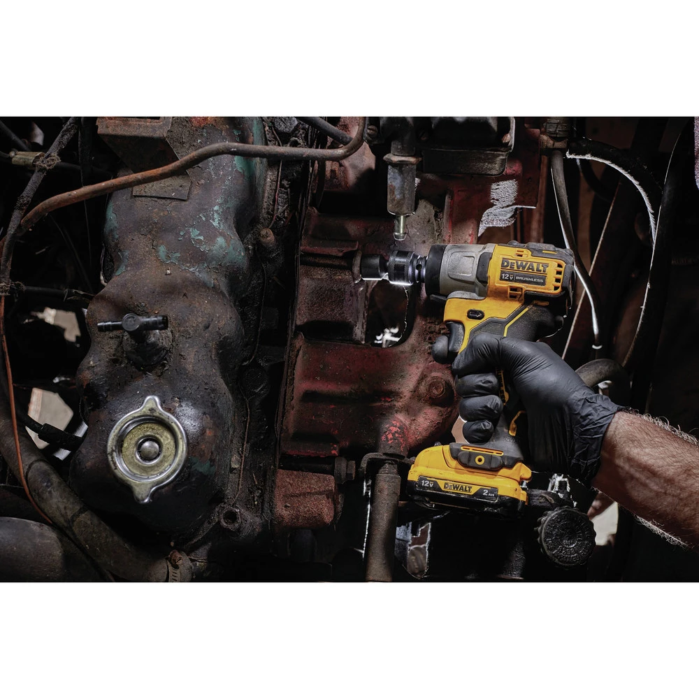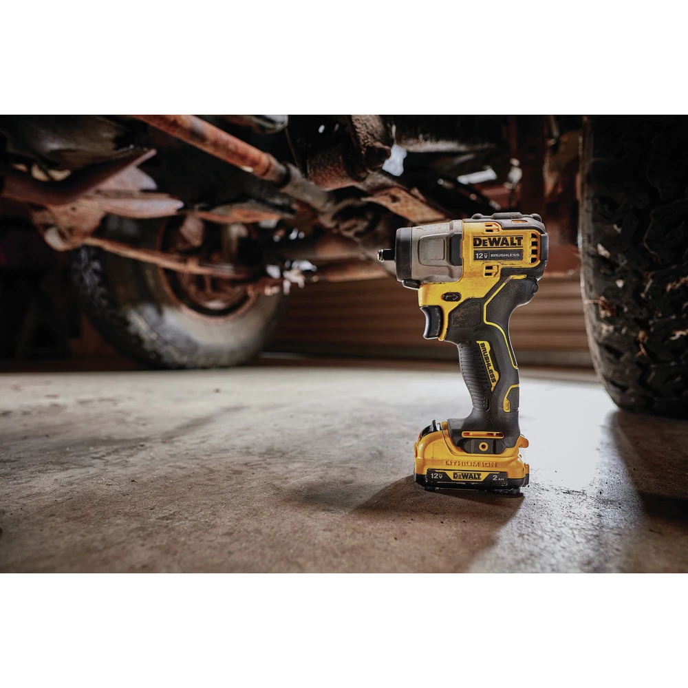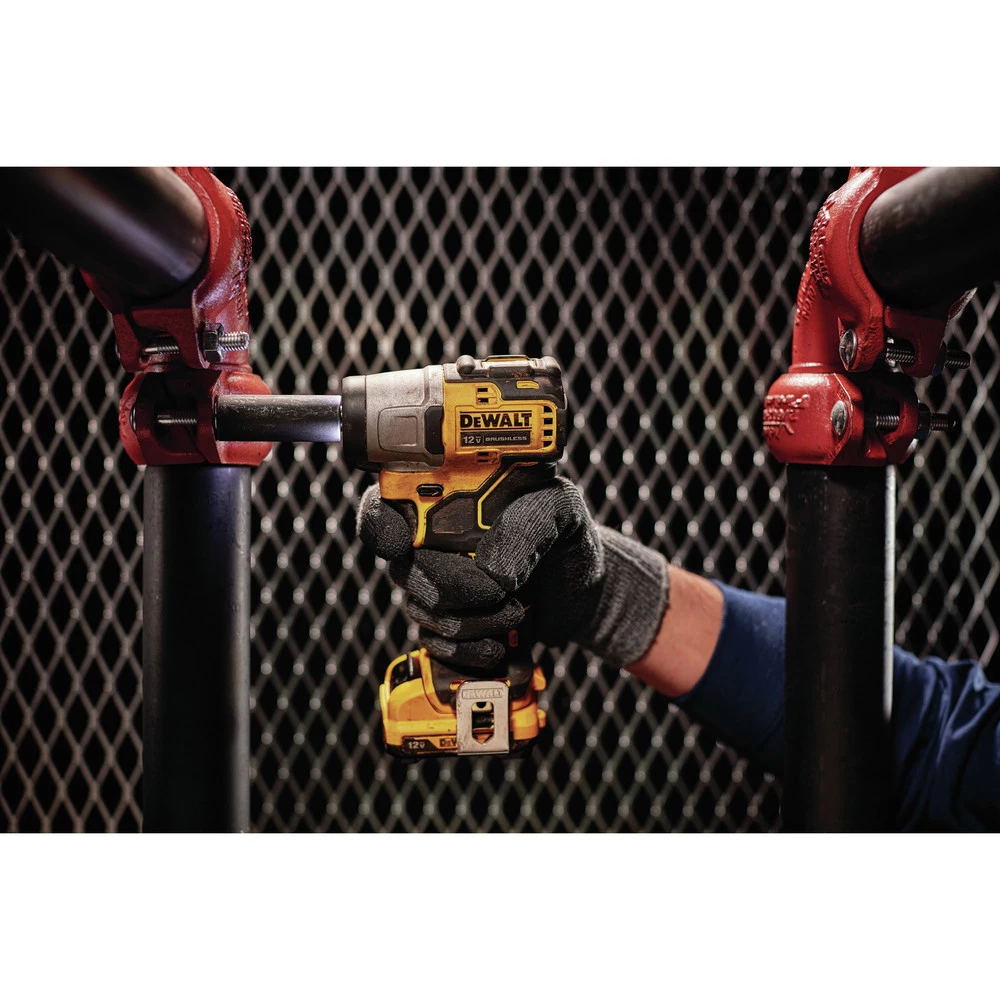 - Includes DCF902B 12V MAX Brushless 3/8 in. impact wrench, (2) DCB122 12V MAX batteries with state of charge indicator, DCB112 12V and 20V MAX charger, belt clip and a kit bag