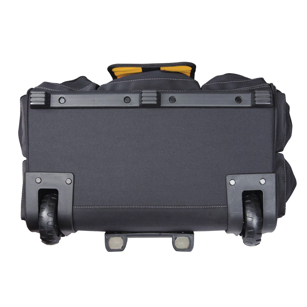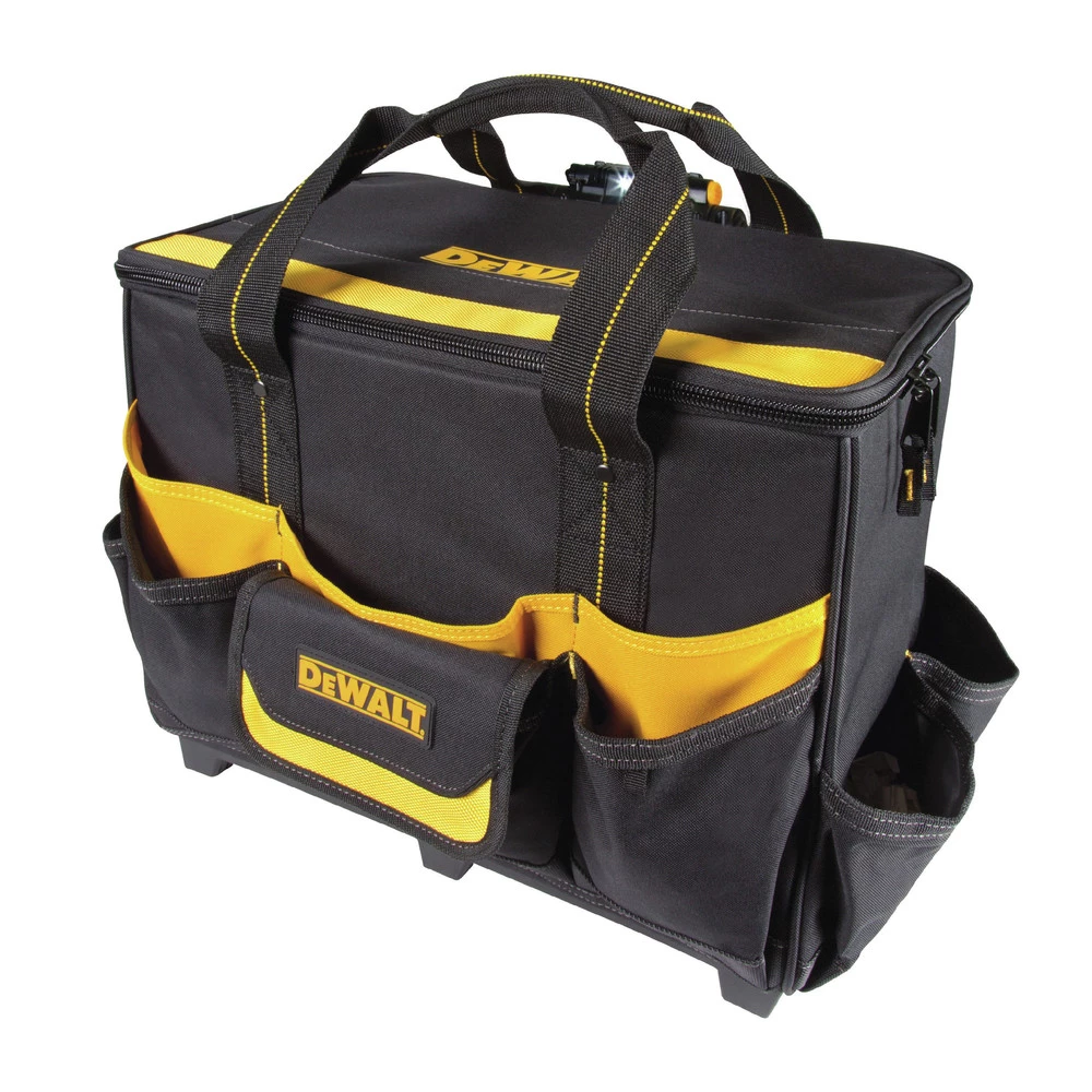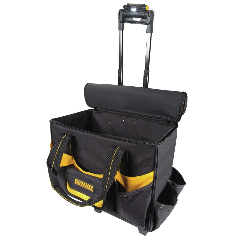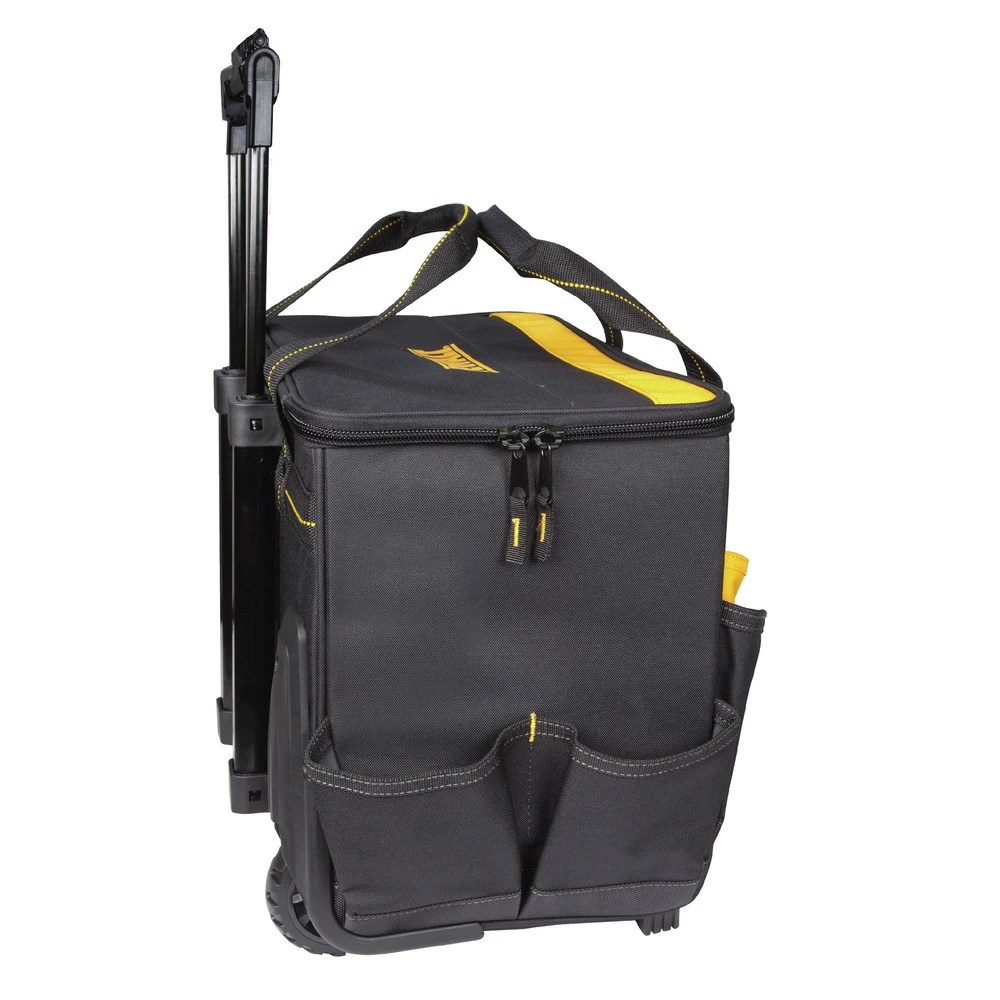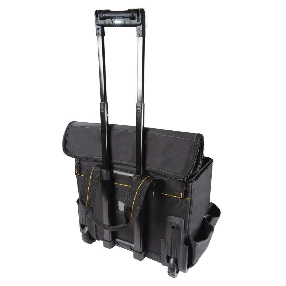 - Magnetic folding zipper top conveniently attaches to telescoping handle for full access to main compartment