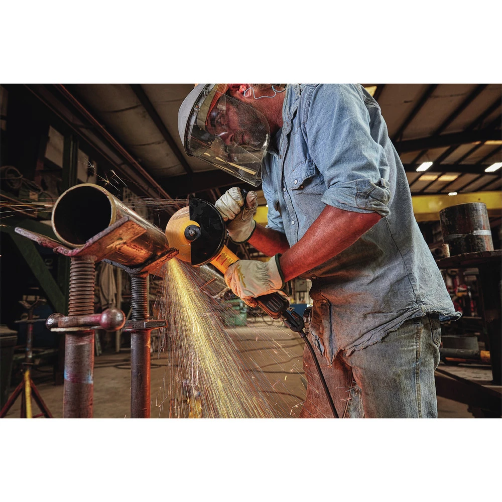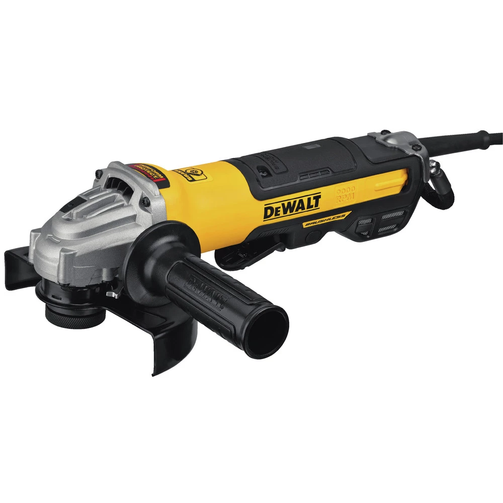 - Kickback Brake engages when a pinch, stall, or bind-up event is sensed and the electronic brake engages with maximum force to quickly stop the wheel, reduce the movement of the grinder and shut the grinder off.